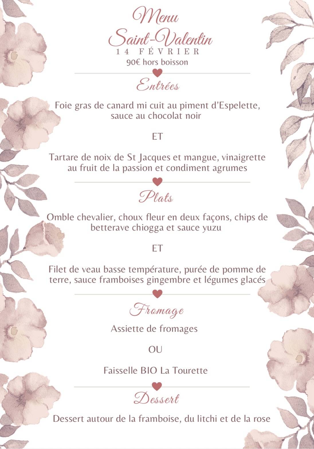 Le menu de la Saint-Valentin sera proposé le 14 février. Réservation fortement conseillée, places limitées.